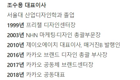조수용 대표는 네이버에서 활동할 당시 네이버의 상징이 된 초록색 직사각형 검색창과 네이버 사옥 '그린팩토리' 건축을 총괄하기도 했습니다. 이후 조수용 대표는 2016년 카카오 브랜드 총괄 부사장으로 영입되었으며, 2018년 3월 카카오 대표이사로 선임되었습니다.