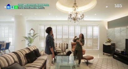공개된 안방은 깔끔한 화이트 톤에 골드로 포인트를 준 모습. 거실은 직접 발품 팔아 골랐다는 샹들리에가 눈길을 끌었습니다. 특히 우물처럼 파여있는 천장 몰딩은 화려함을 더했는데요.
