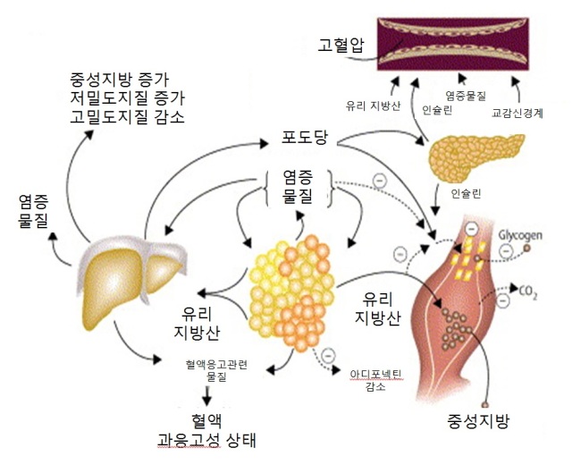 ▶ 내장지방의 증가 → 내장지방에서 유리지방산 분비 → 인슐린 저항성 증가 → 고혈당