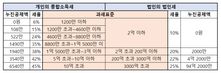 법인의 법인세는 개인의 종합소득세보다 상대적으로 부담이 적습니다. 개인이 1200만 원을 초과하면 세율이 15%로 올라가는 반면 법인은 2억까지 10%를 유지합니다. 2억을 넘겨도 세율 상승 폭이 훨씬 작은 것을 확인할 수 있습니다.