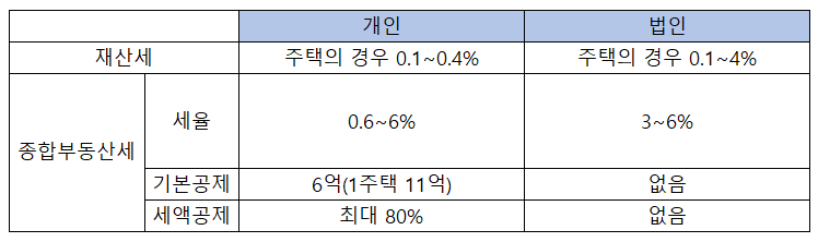 보유세에 있어서는 법인이 개인에 비해 상당히 불리합니다. 개인과 달리 공제액이 적용되지 않고 세율도 최고세율이 적용됩니다.