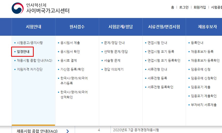공무원 시험일정을 확인할 수 있는 곳은 인사혁신처가 운영하는 사이버국가고시센터입니다. 이곳에서 시험안내, 원서접수, 시험문제/정답, 서류전형/면접시험 등에 대한 정보를 얻을 수 있기에 공무원 준비하시는 분이라면 필수 사이트입니다.