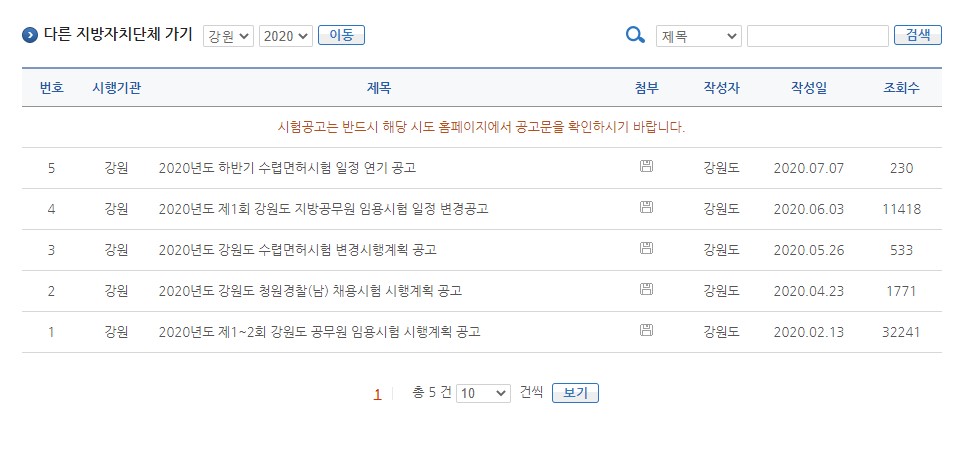 지방 공무원 시험일정은 시험시행정보 - 시험공고에서 확인할 수 있습니다. 지방자치단체마다 일정이 다르기 때문에 상단에서 전체 대신 원하는 지역을 선택하면 좀 더 빠르게 공고를 확인할 수 있습니다. 임의로 강원도로 이동해서 시험일정을 살펴봤습니다.