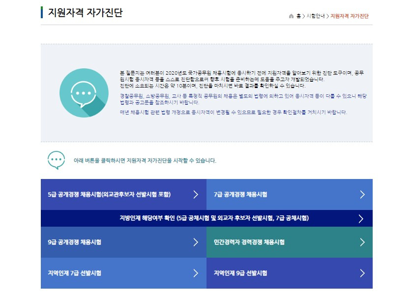 아마도 공무원 시험에 많은 응시생들이 몰리는 이유는 누구에게나 열려 있는 블라인드 테스트이기 때문일 것입니다. 그럼에도 공무원의 종류가 많기에 내가 해당 시험에 자격이 되는지 확인을 할 필요가 있습니다. 사이버국가고시센터에 지원자격 자가진단 테스터가 있습니다.