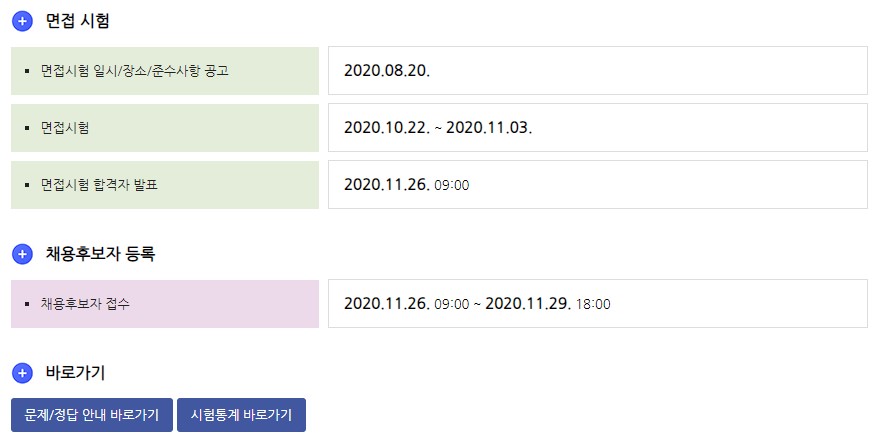 면접시험 일시와 장소, 준수사항 공고는 8월 20일에 나고 면접시험은 10월 22일부터 11월 3일까지 진행됩니다. 합격자 발표는 11월 26일 오전 9시 예정이고 합격자는 11월 26일 09시부터 29일 18시까지 채용후보자 등록을 해야 합니다.