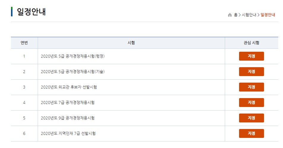 사이버국가고시센터에서 시험 안내 - 일정안내를 보면 공무원 시험일정이 나옵니다. 5급은 행정, 기술 분야, 외교관 후보자, 7급, 9급 공개경쟁채용, 지역인재 7급 시험에 대한 일정이 안내되어 있습니다. 관심 있는 시험은 로그인 후 지정해두면 좀 더 편리하게 이용할 수 있습니다.