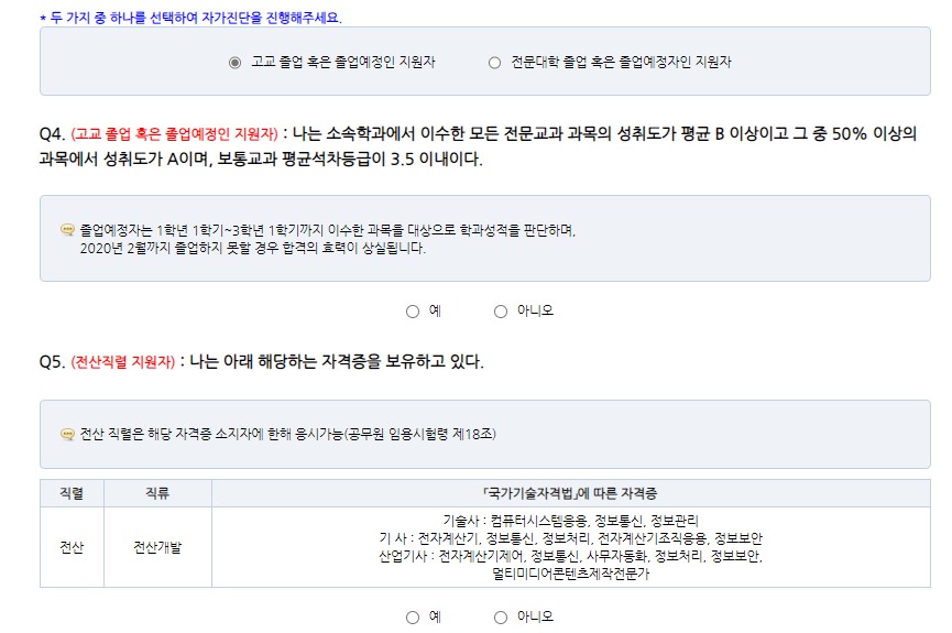 진단에 소요되는 시간은 약 10분 가량이고 결과를 바로 확인할 수 있습니다. 경찰, 소방공무원, 교사와 같은 특정직 공무원은 별도의 법령에 의해 응시자격이 정해져 있습니다. 임의로 지역인재를 선택해보니 일반적인 공무원 응시 결격사유가 있는지 성적, 자격증 여부를 묻습니다.