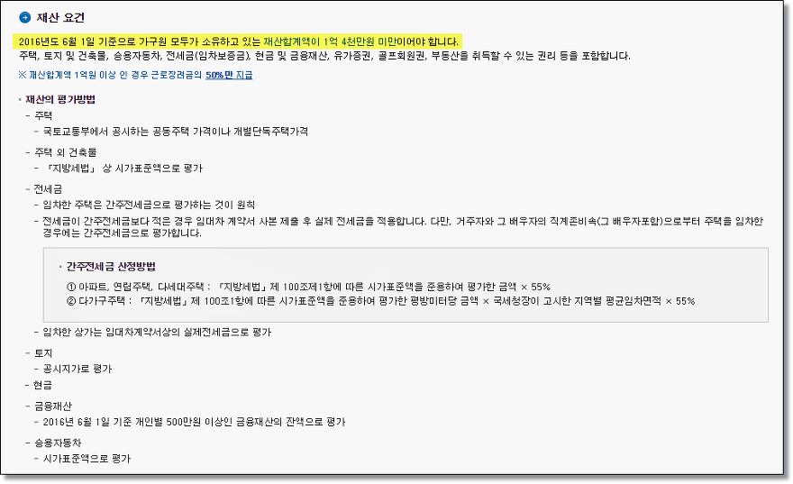 그래서 국세청에서는 2016년 6월 1일 기준으로 가구원 모두가 보유하고 있는 재산이 1억 4천만원 미만인 분들에게만 지원하고 있습니다. (1억원 이상일 경우 50%만 지급하고 있습니다.)