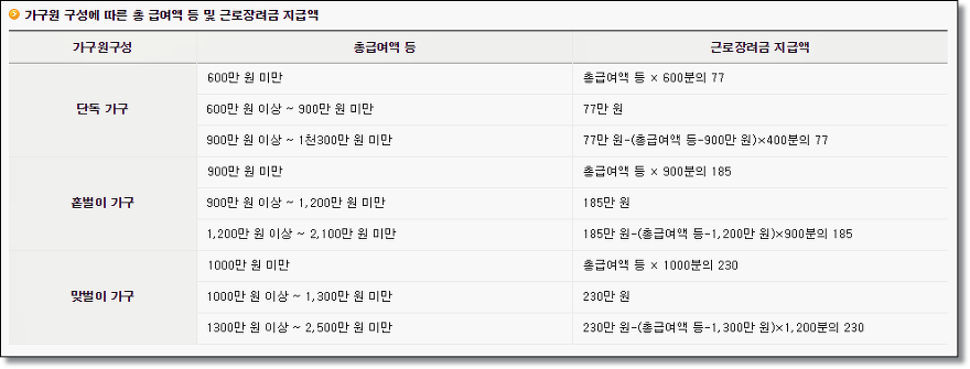 근로장려금은 일을 하고 있지만 소득이 적어 생활이 어려운 근로자에 대해 가구원 구성과 총급여액 등에 따라 국가에서 일정 금액을 지급해 근로를 장려하고 실질소득을 지원하는 소득지원제도입니다. 부부합산 총급여액 등을 기준으로 지급되는데 1년 최대 지급액은 230만 원입니다.