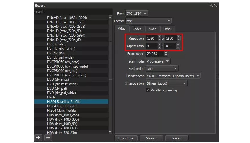open file을 클릭해 비디오를 열고 프로파일은 H.246을 선택하는 것이 일반적입니다. 압축에는 옵션이 많이 존재합니다. 해상도 또는 가로 세율 비율 필드로 비디오 크기를 조정할 수 있습니다. 낮은 품질을 선택할 경우 자동으로 해상도가 조정되고 내보내기 옵션을 사용해 원하는 파일 형식을 정확하게 가져올 수 있습니다.