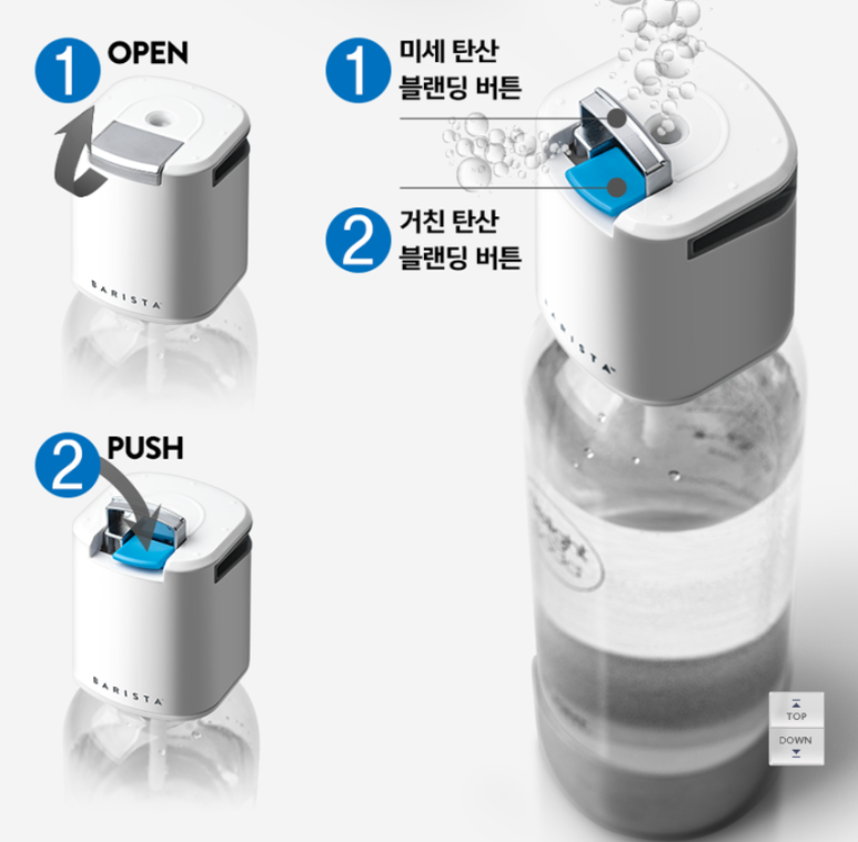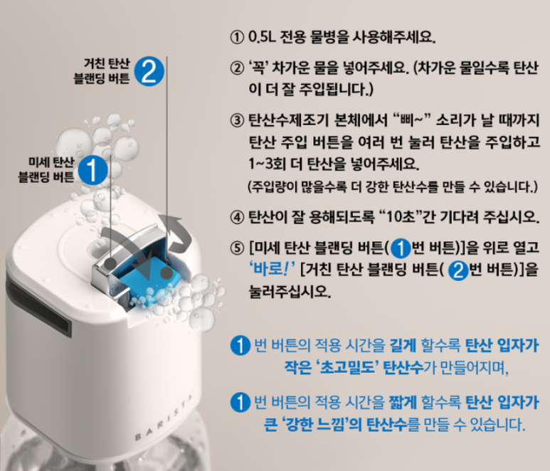2개의 버튼으로 탄산을 블렌딩 할 수 있습니다. 사진의 은색 ①번 버튼을 눌러 탄산 입자를 더욱 '미세하게' 만들고, 파란색 ②번 버튼을 누르면 탄산 입자를 더 '거칠게' 만들 수 있습니다. 두 개의 버튼 적용 시간을 달리하면 탄산 입자 크기를 조절해 다양한 밀도의 탄산수를 만들 수 있다고 합니다.