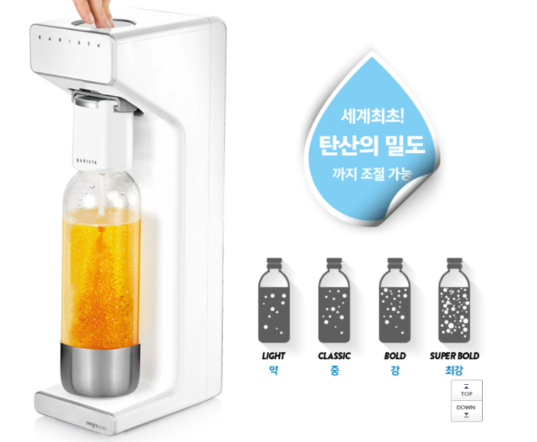 딜라이트소다 바리스타 제품을 사용 중인데요. 특허받은 '마이크로 버블 시스템'으로 기존 탄산수 제조기에서는 절대 구현할 수 없는 부드러운 초미세 마이크로 고밀도 탄산수부터 기존 제품 대비 2배 강한 강력한 탄산수까지, 원하는 탄산의 강도는 물론이고 세계 최초로 탄산의 밀도와 버블 사이즈까지 자유롭게 조절할 수 있다고 합니다.