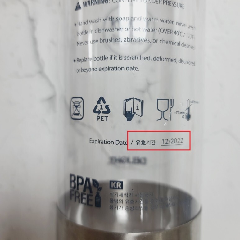 아래 사진은 전용 물병으로 대용량 1L, 소용량 0.5L입니다. 각 물병마다 유효기간이 있습니다. 딜라이트소다에서는 탄산을 최초 주입한 후 2년간 사용이 가능하다고 하며 물병에 표시되어 있는 날짜는 크게 상관이 없다고 합니다.(인증 시점을 기준으로 쓰인 부분이며 해외 수출법상 표시된 부분이라는 설명입니다)
