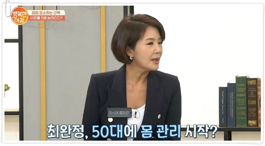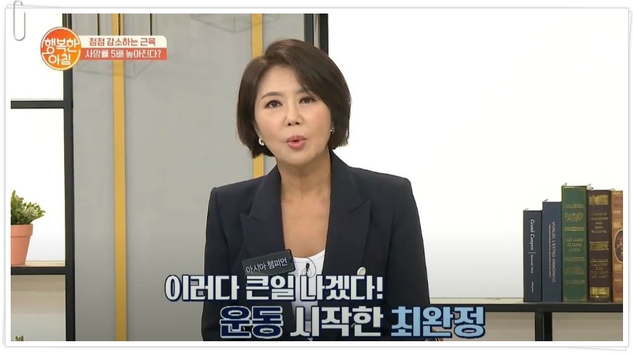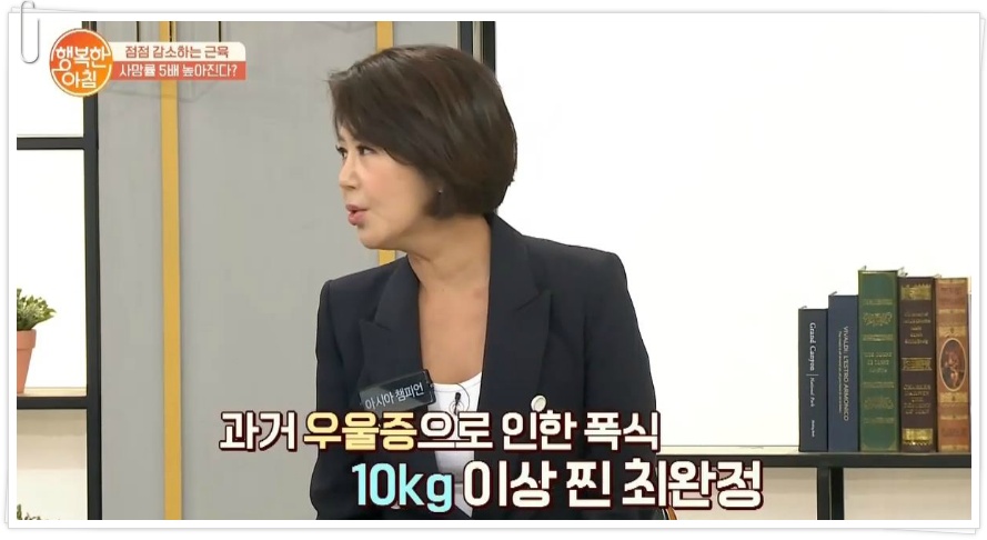계단 오르기 운동으로 10kg 감량한 최완정. 그는 계단 오르기 협회를 설립했다면서 계단 오르기 운동을 추천했다. 이날 최완정은 "우울증, 불면증을 갖고 계신 분들이 정말 많다. 그런데 계단 오르면 사람이 달라진다. 그래서 강의를 다녔다"고 운을 뗐다.