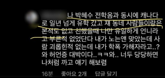 B씨 : 나 박혜수 전학옴과 동시에 캐나다로 1년 넘게 유학 갔고, 쟤 동네 사람들이랑은 본 적도 없고 친했을 때 나만 유일하게 언니라고 부른 적 없었단다. 내가 노는 애는 맞았는데 사람 괴롭힌 적 없는데...