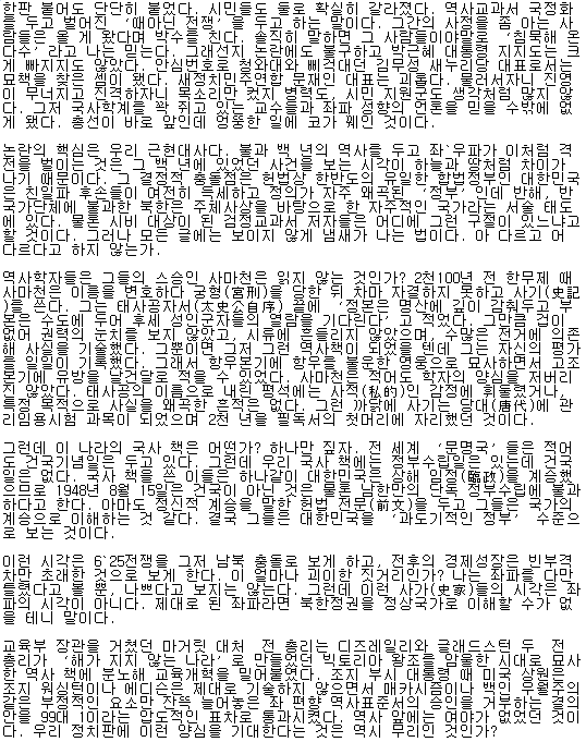 전원책 역시 전형적인 우파답게 우리나라의 근현대사를 '좌파 집필진들'이 왜곡된 방향으로 서술하고 있고, 또 그에 대한 해결책으로 '교과서 국정화'밖에 없다고 주장하고 있죠.