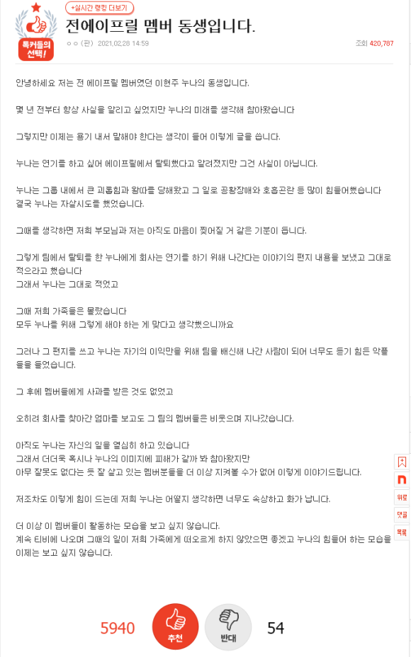 지난달 28일 한 온라인 커뮤니티에는 ‘전(前) 에이프릴 멤버 동생입니다’라는 제목의 게시물이 올라왔다. 이현주와 가족관계임을 증명하는 문서를 첨부한 누리꾼 A씨는 이현주가 에이프릴에서 괴롭힘과 왕따를 당했으며 이로 인해 공황장애와 호흡곤란 등을 겪었다고 주장했다. A씨는 “결국 누나는 극단적 선택을 시도했다. 그때를 생각하면 부모님과 나는 아직도 마음이 찢어질 거 같은 기분이 든다”고 호소했다. 이어 이현주의 친구도 함께 폭로하며 목소리를 높였다.