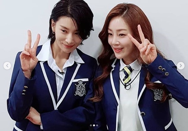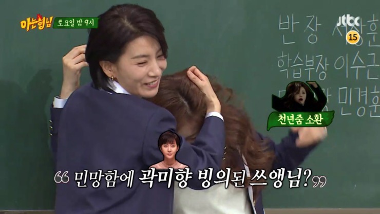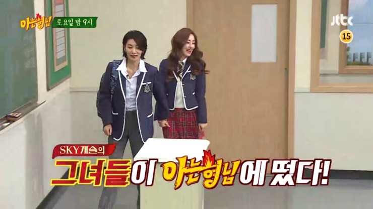카리스마 넘치는 중성적인 매력을 보여주는 쓰앵님 김서형은 숏컷 헤어스타일과 아형 교복도 터프하게 바지를 입고나왔고, 푼수끼있고 귀여운 찐찐이 오나라는 러블리한 펌헤어에 빨간 체크 치마 교복을 입고 등장. 오나라 김서형 두사람 다 40대의 나이에도 교복이 꽤 잘 어울립니다 ㅎㅎ