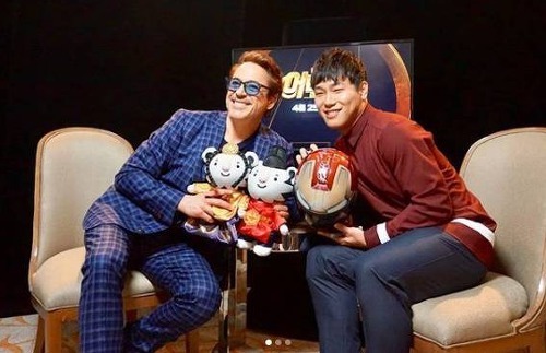 윤성빈은 싱가포르 어벤져스:인피니티워 프리미어에 참석하여 로버트 다우니 주니어와 함께 시간을 보내며 인터뷰를 했는데요. 본인의 헬멧에 싸인을 받기도 했습니다.