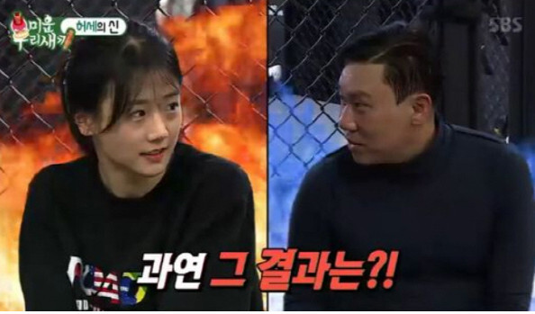 김보성의 부름을 받아 나온 이상민 스파링 파트너는 앳된 외모의 여성 파이터 이수연이었습니다.
