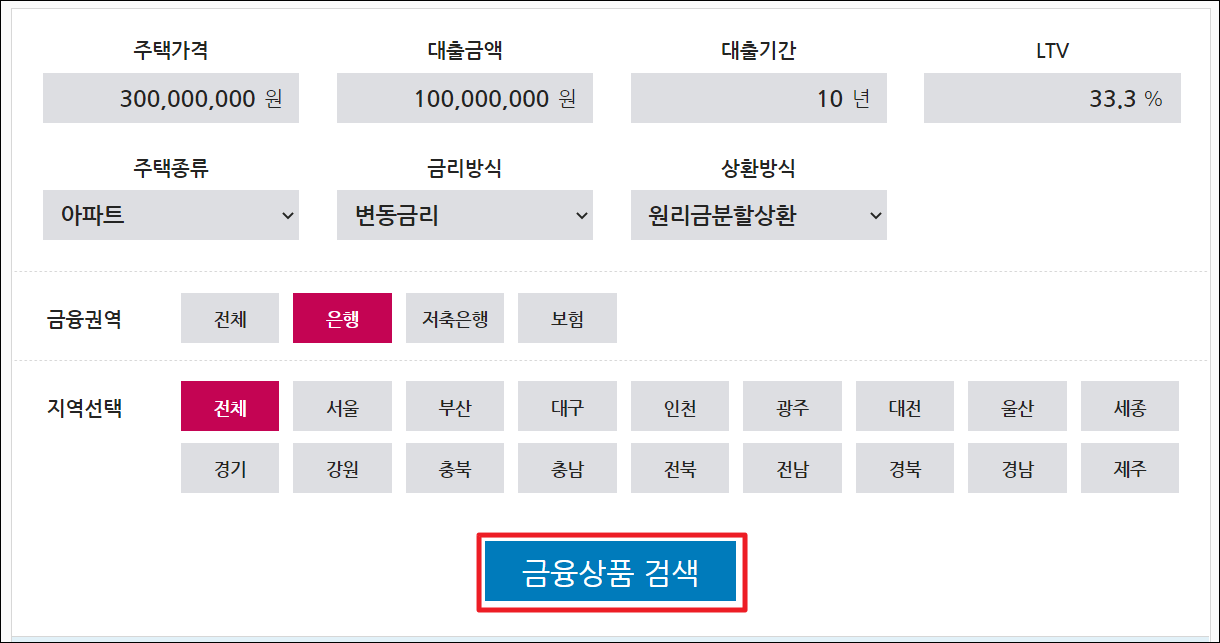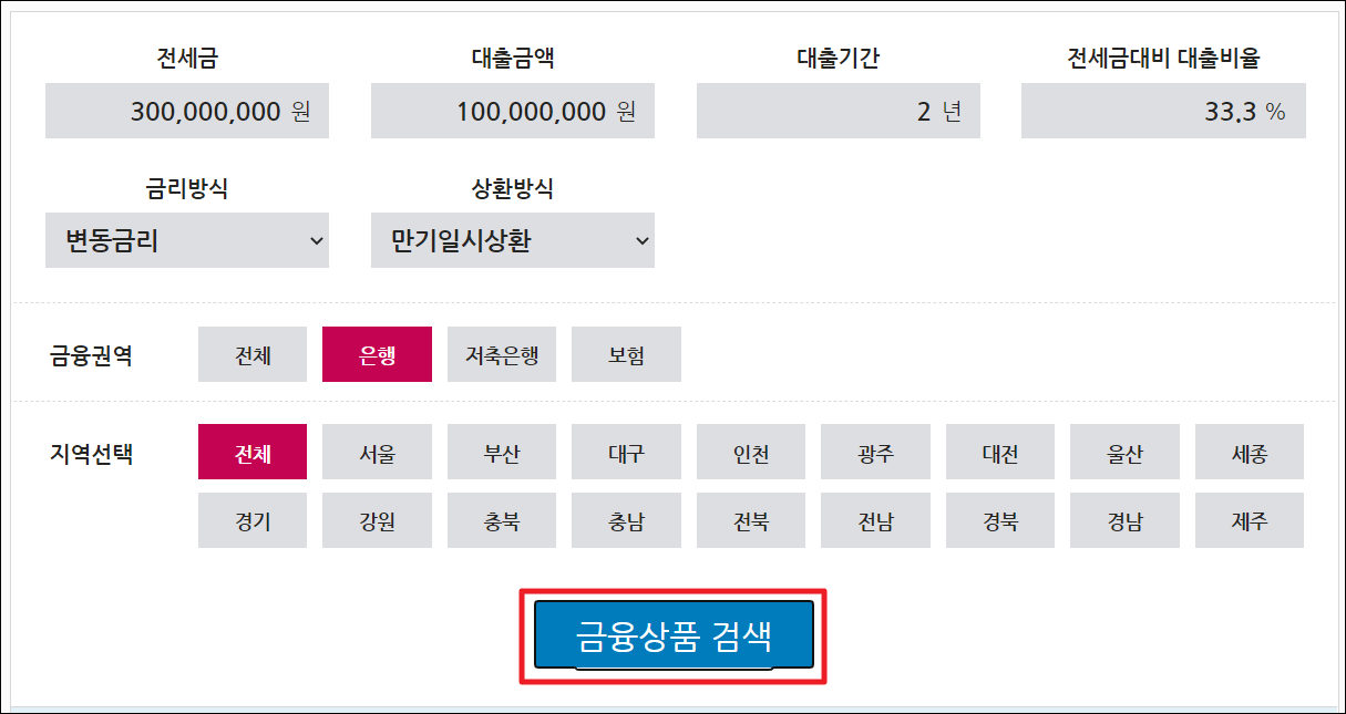 아래와 같이 조건을 입력하는 페이지가 나옵니다. 자신의 조건에 맞게 설정한 뒤, 금융상품 검색 버튼을 클릭합니다.
