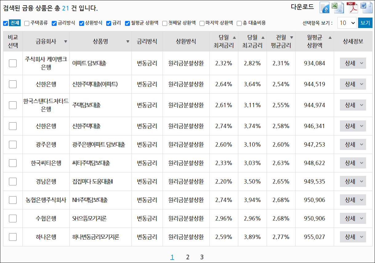 리스트에서 지표들을 바탕으로 주택담보대출 상품들을 비교해 볼 수 있으며, 해당 리스트를 클릭해 각 상품의 상세 정보를 확인할 수 있습니다.