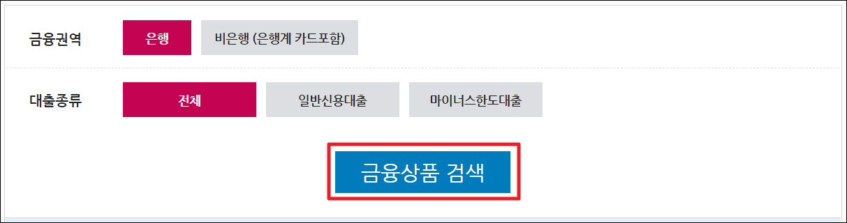 개인신용대출은 입력할 조건이 거의 없다고 볼 수 있습니다. 그래도 중요한 조건인 은행권이나 아니냐, 일반신용대출이냐 마이너스한도대출이냐는 설정할 수 있습니다.