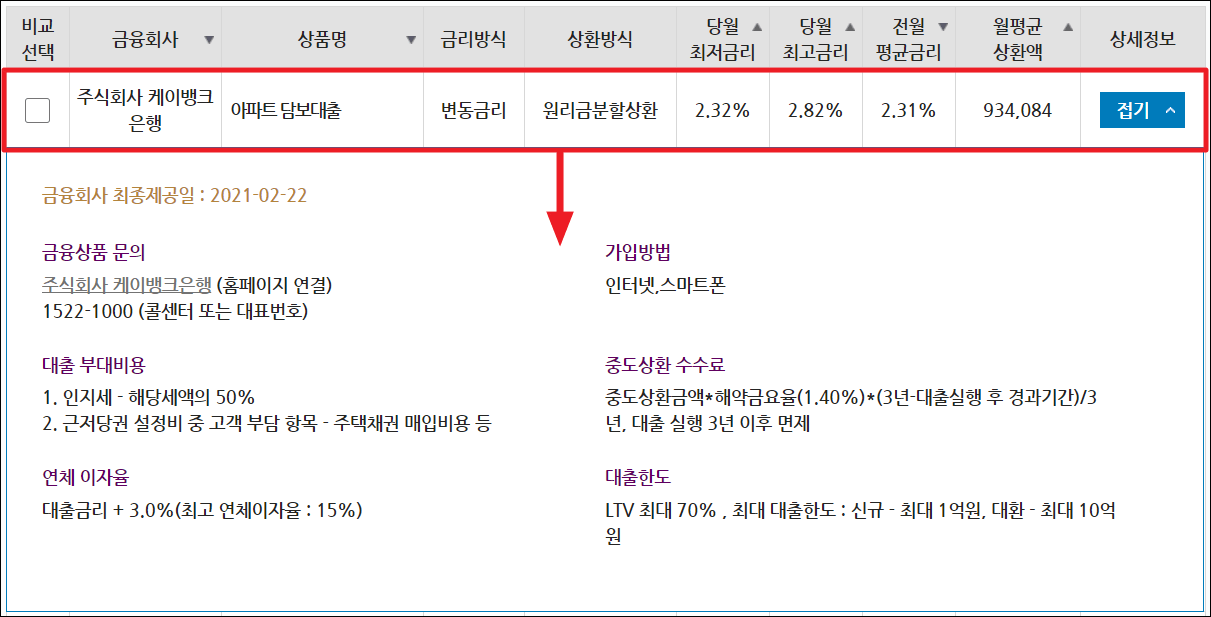 - 금리방식 : 대출상품에 적용되는 금리가 계약기간 동안 변하지 않는 경우 고정금리, 변동되는 경우 변동금리
