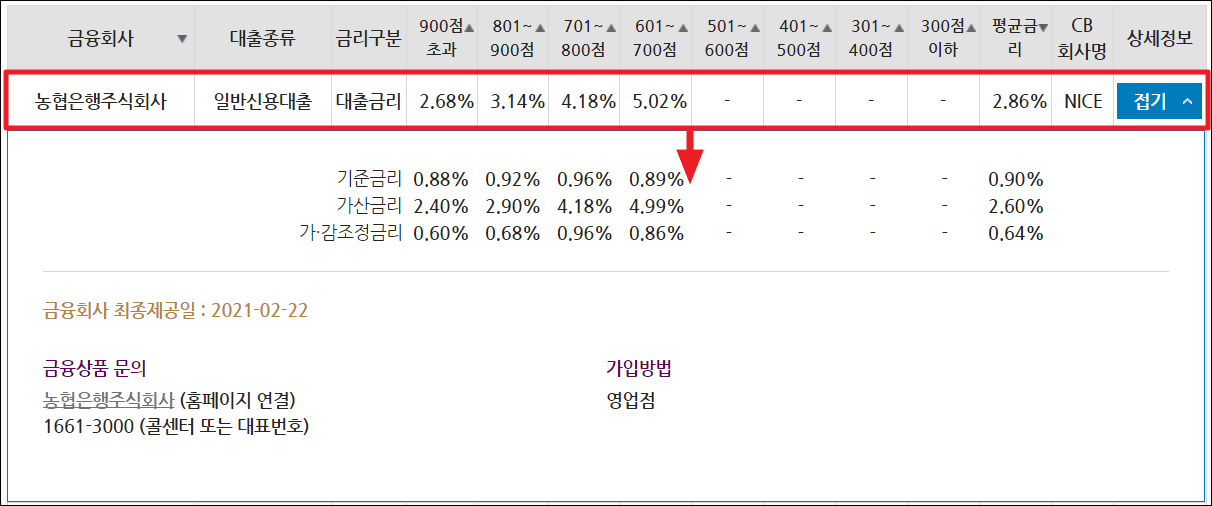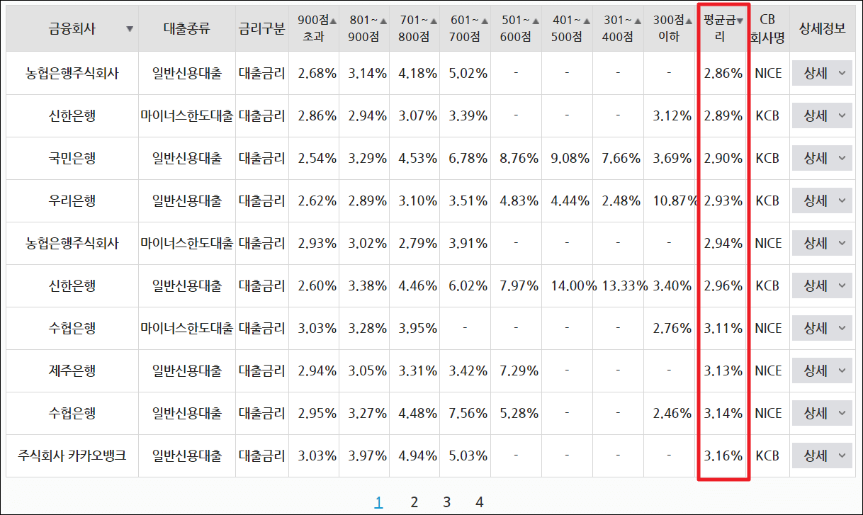 자신의 신용 등급에 따라 세분화된 이자율을 볼 수 있습니다. 이번에 신용등급 기준이 바뀌어서 점수 대가 조금 생소하기는 합니다. 본인의 등급에 맞는 이자율을 기준으로 정렬해서 비교하면 좋을 것 같습니다.