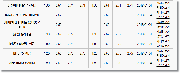 현재 정기예금 12개월 기준으로 가장 높은 금리를 받을 수 있는 7가지 상품입니다. 세종이 2.66%로 가장 높습니다. 상품들을 확인할 때 주의해야할 점은 충족시켜야하는 조건이 있을 수 있으므로 반드시 [자세히 보기]를 눌러 확인하시기 바랍니다.