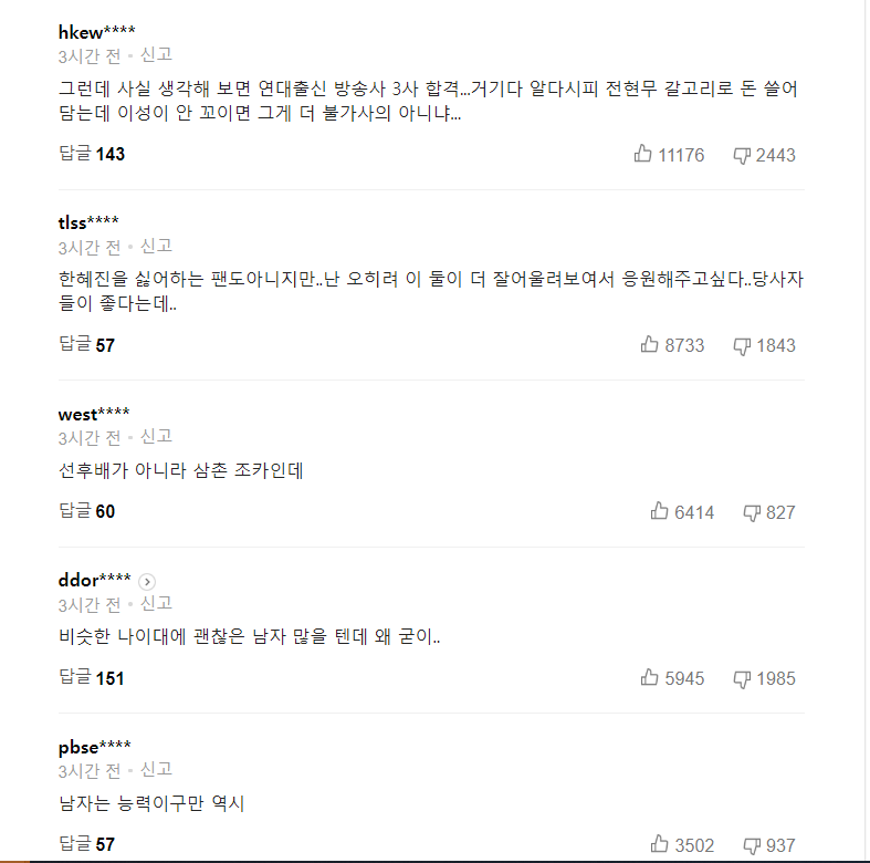 전현무 역시 연대 출신에 방송사 3사 모두 합격한 고스펙이며 현재 방송 수입이 상당한 능력자이기 때문에 납득이 간다는 댓글이 1위이며, 나이차가 많은 것을 보고 불편해 하는 사람들도 많다.