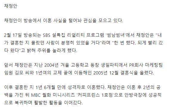 채정안의 전남편은 30대에 임원을 달 정도로 능력남에 재력남으로 알려져 있었는데 둘은 성격차이로 인해 결국 1년 6개월만에 이혼을 했습니다.