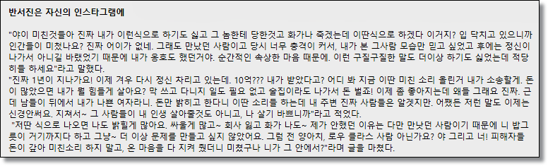 해당 글은 현재 삭제된 상태이며 이 글 이후 "제가 본 그 사람은 바보 같은 사람, 많이 부족해서 지켜주고 싶은 평범한 사람이었다."고 밝히기도 했습니다. 게다가, 자신이 운영하고 있는 쇼핑몰 <반러브> 대표직에서 물러났습니다. 전 남자친구 때문에 많이 힘들었을 것 같습니다.
