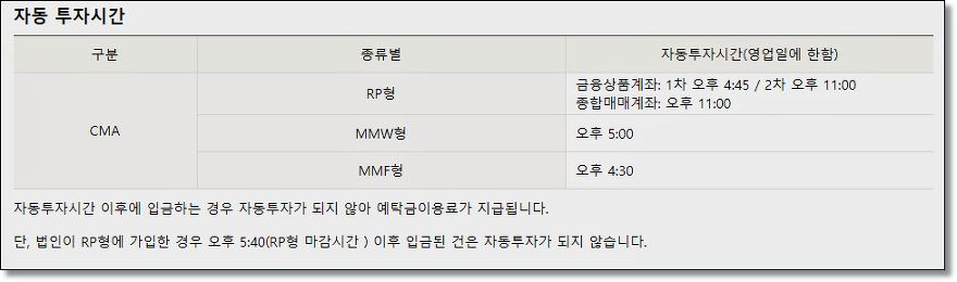 RP형은 금융상품계좌 1차는 오후 4시 45분, 2차는 오후 11시에 자동투자되며 이 시간 이후 입금하는 경우 자동투자가 되지 않아 예탁금이용료가 지급됩니다.