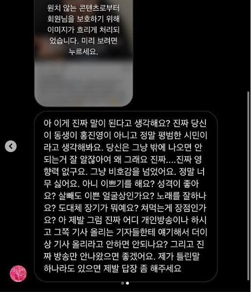 이를 본 네티즌들은 "저런 말은 무시하세요 언니", "시기 질투는 받아주는 게 아니다", "세상에 이상한 사람 참 많다" 등 응원의 말을 남겼다.