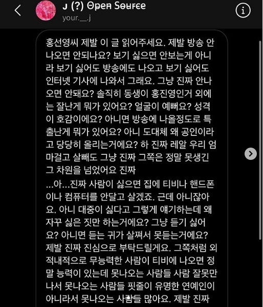 지난 6일 홍선영 인스타그램에는 누리꾼으로부터 다이렉트 메세지 내용을 공개하며 장문의 글을 게재했다. 홍선영에게 "홍선영씨 제발 이 글 읽어주세요. 제발 방송 안나오면 안되나요?"라고 말을 이어갔다. 이어 "솔직히 동생이 홍진영인 거 외에 잘난 게 뭐가 있어요?"라며 팩트를 콕 찝어 얘기했다.
