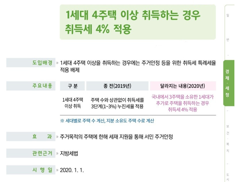 취득세 계산법에서 보다시피 부동산 취득세율가 정말 중요합니다. 올해 달라진 부분이 있는데, 그 중 하나가 주택 취득시 세대 합산 4주택 이상일 경우 주택 유상거래 특례세율 적용이 배제되어 4%가 적용됩니다. 이것은 상가나 오피스텔과 동일한 세율입니다. 농어촌 특별세 0.2%, 교육세 0.4%까지 합산하면 총 4.6%입니다.