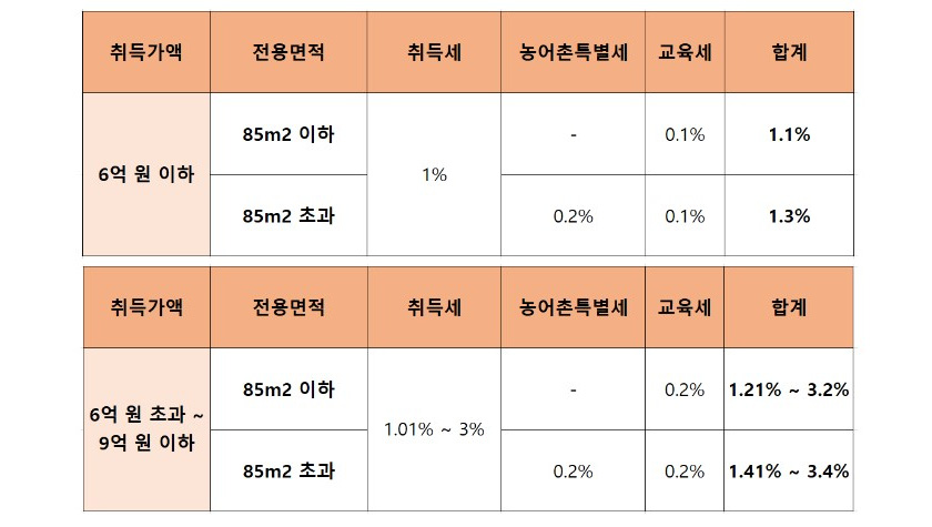 두번째 변화는 3주택 이하의 유상거래 취득시에도 6~9억 이하 구간의 취득세율이 과거 2% 단일세율에서 1~3%로 세분화되었습니다. 7억은 1.67%로 변경되면서 이전에 비해 231만원 줄어 들었지만 8억, 9억의 경우는 2.33%, 3.00%로 인상됨에 따라 취득세가 각각 264만원, 900만원이 증가되었습니다.