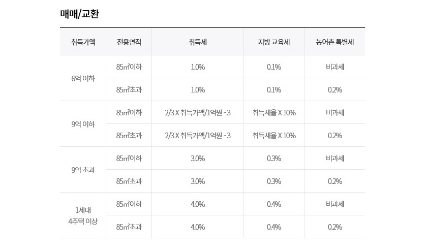 가장 다수인 취득원인인 매매나 교환에 의할 경우 위의 표에서 확인할 수 있습니다. 부동산 취득세율은 취득가액에 따라 전용면적 크기에 따라 달라집니다. 농어촌 특별세는 85제곱미터 이하에는 발생하지 않습니다. 취득세는 6억원 이하의 경우 1%로 취득세율이 높지 않지만 9억을 초과할 경우 3%까지 오릅니다.