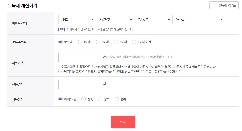 그럼에도 좀 더 손쉽게 취득세를 계산하고 싶다면 여러 곳에서 제공되는 부동산 계산기 서비스를 이용할 것을 추천합니다. 부동산114에서도 취득세 계산하기가 가능한데, 주택이 있는 지역, 보유주택수, 취득가액, 전용면적, 취득방법을 입력하면 취득세가 계산되어 나옵니다.