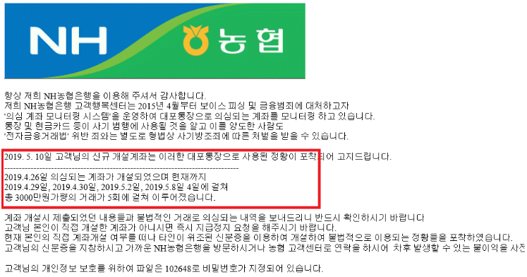 이것은 피싱 메일을 떠나 실제 인터넷뱅킹 거래내역이 알고 있었다는 뜻인데, 우연의 일치일까요? 아니면 농협에 있는 제 통장의 거래내역이 노출된 것일까요? 의구심이 계속 들 수밖에 없는 상황입니다.