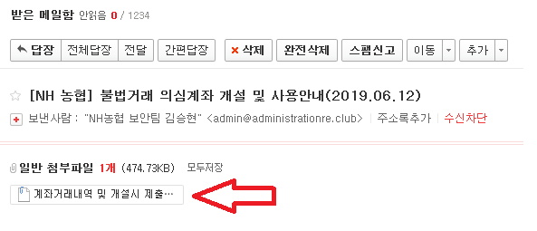 그리고, 중요한 것이 첨부파일인데요. 계좌 거래내역 및 개설 시 제출서류라는 제목으로 같이 왔는데, 일반적으로 알려진 확장자는 아닙니다.
