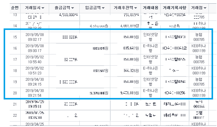 그래도, 혹시나 하는 마음에 농협 인터넷뱅킹에 들어가서 거래내역을 살펴봤습니다. 헉! 그런데 메일 내용에 있던 4월 30일, 5월 2일, 5월 8일에 실제 이체거래가 있었습니다.