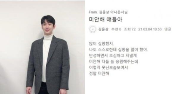 김윤상 아나운서는 음주운전 적발 다일인 3월 4일 자신의 팬카페에 '미안해 얘들아'라는 제목의 글을 올려 팬들에게 직접 사과했습니다.