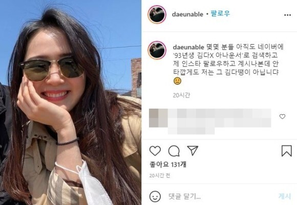 김다은은 14일 자신의 인스타그램에 “몇몇 분들 아직도 네이버에 '93년생 김다X 아나운서'로 검색하고 제 계정을 팔로우하고 계시나본데 안타깝게도 저는 그 김다X이 아닙니다”라고 밝혔다.