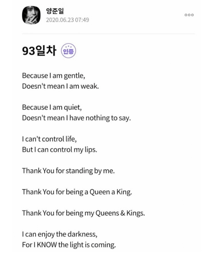 양준일이 이날 카카오100일에 올린 글은 “내가 신사적이라고 해서 약하단 뜻은 아니다. 조용히 있다고 해서 할 말이 없는 건 아니다. 삶을 조종할 순 없지만 내 입은 제어할 수 있다. 날 지지해줘서 감사하다. 퀸과 킹(팬클럽)이 되어줘 감사하다. 빛이 온다는 걸 알고 있기 때문에 어둠도 즐길 수 있다”는 내용을 담고 있다.