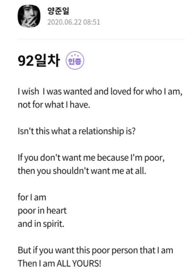 또한 전날인 22일에도 “제가 갖고 있는 것 때문이 아니라 어떤 사람인지에 따라서 바래지고(원하고) 사랑받았으면 합니다. 이게 관계 아닐까요? 제가 부족하다는 이유로 저를 원하지 않으신다면 여러분은 저를 전혀 원해서는 안됩니다. 왜냐하면 저는 마음과 영혼이 가난한 사람이니까요”라며 “하지만 여러분이 만약 있는 그대로의 이 부족한 사람을 원한다면, 저의 전부는 여러분의 것입니다”라는 글도 올렸다.
