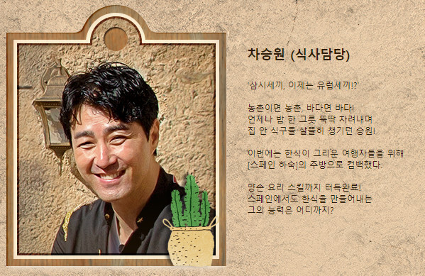 자타공인 음식요리사 차승원은 '삼시세끼'에서도 수준급 요리실력을 보여줬는데 스페인하숙에서도 역시 요리를 담당하며 하숙을 하러 오는 여행객들에게 따뜻한 한식을 대접한다고 합니다.